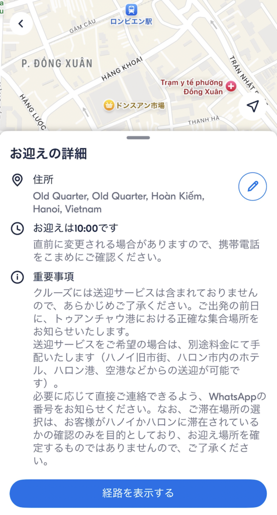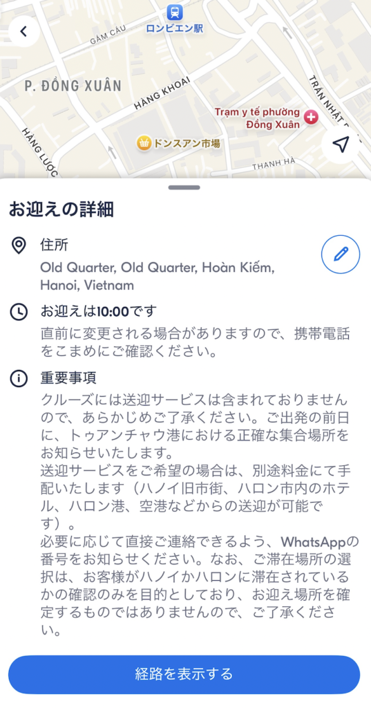 予約後も送迎は10時にこの場所、と明確に示されている。